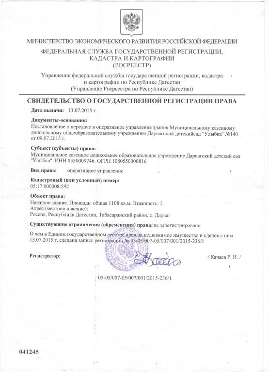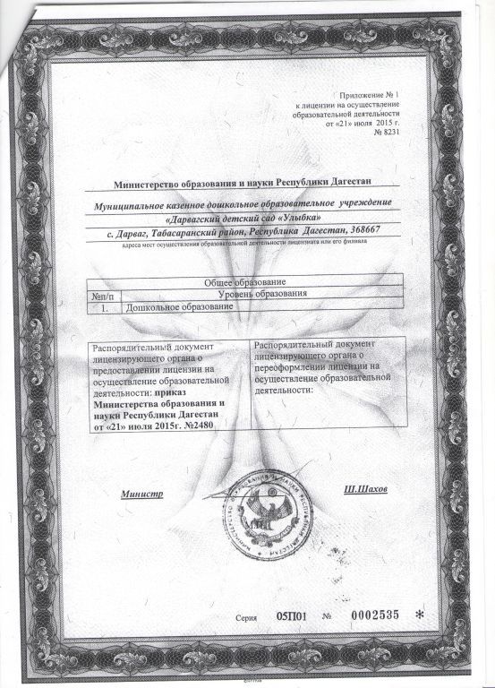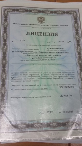 | Полное наименование образовательной организации* | Муниципальное казенное дошкольное образовательное учреждение " Дарвагский детский сад"Улыбка" |